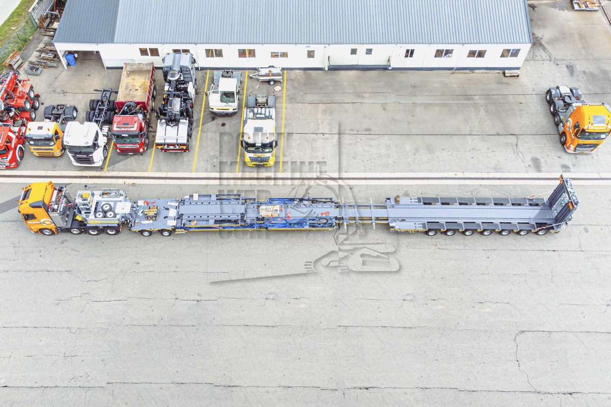 Het voorste draaistel is uitgerust met twee pendelassen van het type PA-X, wat een minimale laadhoogte van 790 millimeter, een slag van 600 millimeter en een stuurhoek van 60 graden mogelijk maakt voor optimale wendbaarheid van het voorste gedeelte van de combinatie. De 7-assige achterzijde is voorzien van fuseegestuurde assen, een veelgebruikte oplossing bij het transport van bijzonder lange trams tot 50 meter lengte. Door het gebruik van doorgezette assen wordt de laadhoogte in rijpositie teruggebracht tot 740 millimeter. De laadvloer is aan de gewenste lengte aangepast met robuuste verlengbalken, die dankzij geavanceerde apparatuur zonder heftrucks of kranen kunnen worden gemonteerd of gedemonteerd.