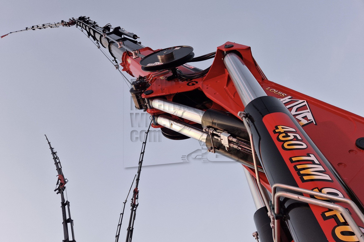 Louis Huys Speciaal Transport en Kraanverhuur uit Venlo heeft een Scania R660 XT in gebruik genomen in een ongebruikelijke configuratie. Het gaat hier namelijk om een 14x4 bakwagen. U leest het goed, een zevenasser met twee aangedreven assen. De indrukwekkende Scania vormt de basis voor een zo mogelijk nog imposantere kraan, namelijk een 450 tonmeter MPG.