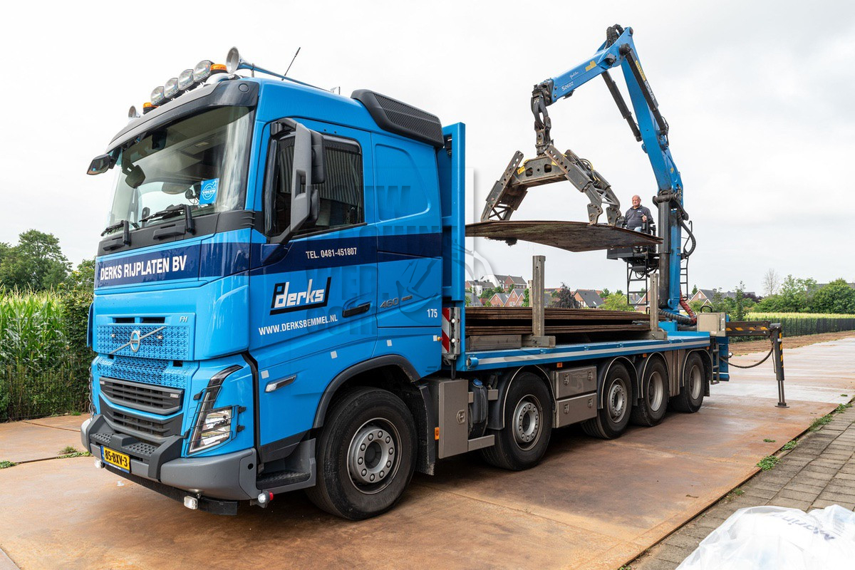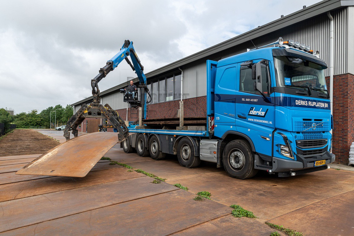 Ook zusterbedrijf Derks Rijplaten vertrouwt op Volvo Trucks. Sinds vorig jaar zet het bedrijf twee Volvo FH 460 10x4-bakwagens in voor het vervoeren en plaatsen van rijplaten. Deze trucks zijn uitgerust met een 26 tonmeter Palfinger Epsilon autolaadkraan, waarmee rijplaten snel en precies kunnen worden gelegd. Ook voor deze trucks zijn wendbaarheid en stabiliteit belangrijk, vertelt Harold Derks. “We werken vaak op bouwplaatsen met oneffen terrein en/of weinig ruimte. Dan moet een truck gewoon stevig en wendbaar zijn. Ook voor deze trucks willen we het maximale toegestane totaalgewicht van 50 ton maximaal benutten. Door de combinatie van een widespread asopstelling, gestuurde achteras en hydraulische vering is dat allemaal mogelijk.”