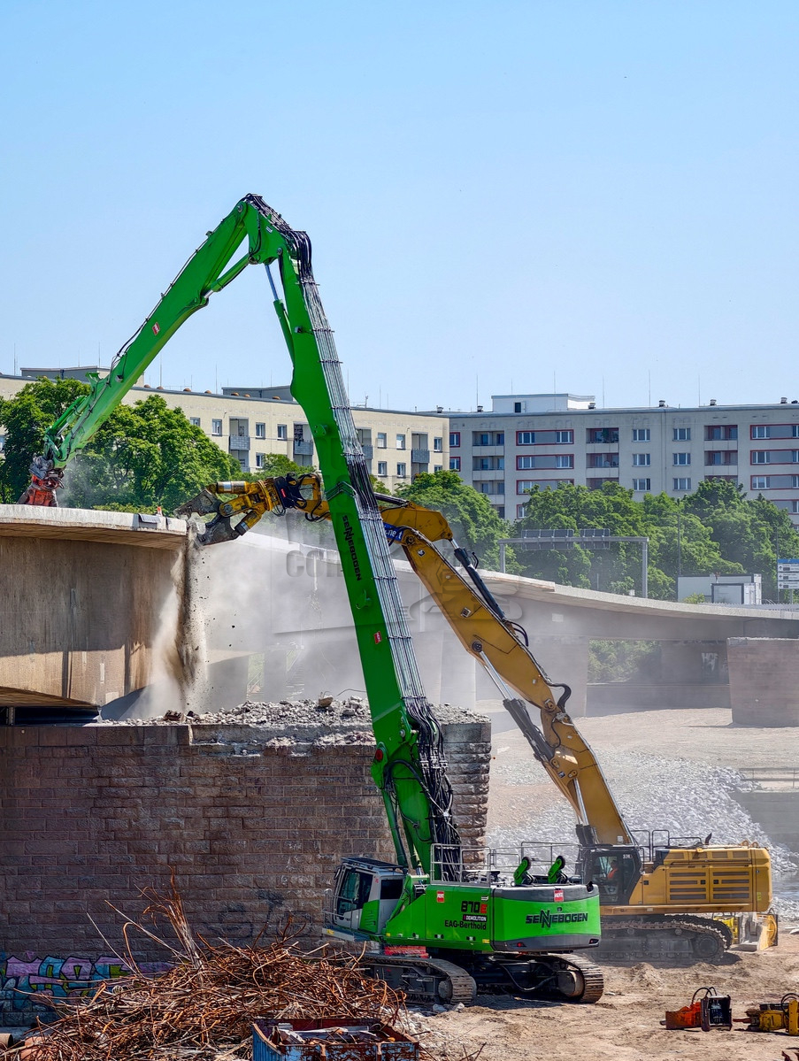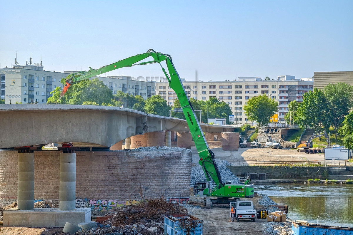 De gedeeltelijke instorting van de Carolabrug in Dresden in september 2024 maakte duidelijk dat de res-tanten van de brug zo snel en veilig mogelijk moesten worden gesloopt. Daarvoor was een echte kracht-patser nodig: de 117 ton wegende Sennebogen 870E longfront-sloopmachine.