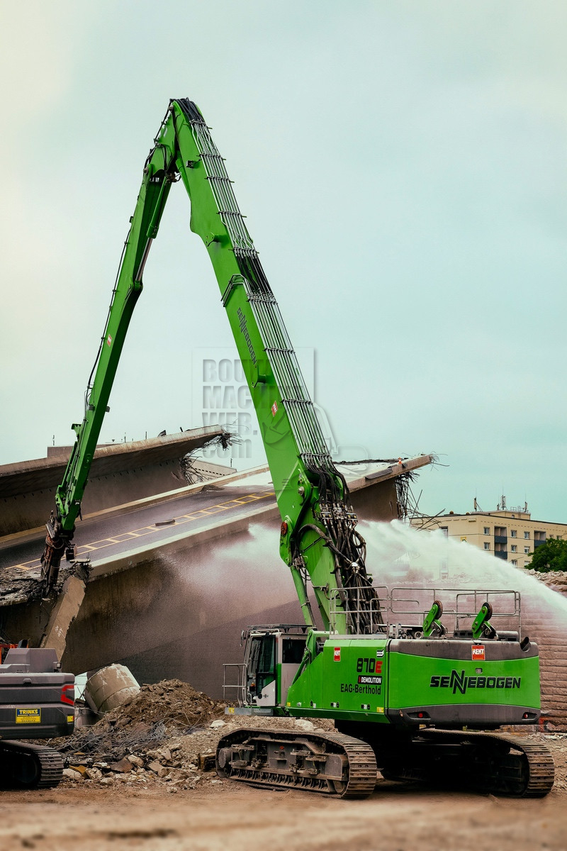 Voor het project werd een longfront-sloopmachine ingezet, die met een bedrijfsgewicht van 117 ton en een reikwijdte tot 36 meter ruimschoots voldeed aan de hoge eisen: de Sennebogen 870 E Demolition kan worden ingezet om gebouwen efficiënt en veilig te slopen, zelfs op grote hoogte, bijvoorbeeld gebouwen tot tien verdiepingen.