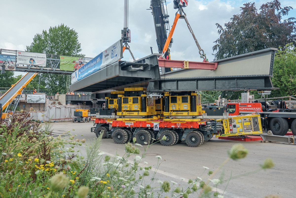 De installatie vindt plaats onder bijzonder uitdagende omstandigheden: twee parallel gekoppelde SPMT-units, een 6-assige en een 4-assige met Power Pack Unit, worden elk gecombineerd met 2x2 Jack-Up-systemen van het type JS 250. Dit maakt het mogelijk om de bruggen onder een hoek van maximaal 43 graden te installeren, rekening houdend met een helling van 8 procent in de rijrichting en 3 procent zijdelings. "Wat vooral uitdagend is, is dat we de bruggen op de SPMT's onder een hoek van 45 of 25 graden moeten plaatsen, met slechts zeer nauwe toleranties binnen de rijpaden in het brugkanaal", legt Schimmel uit. De ondersteuning wordt verzorgd door een 3-puntslagersysteem, terwijl een derde SPMT-unit de bruggen vanuit de tussenopslag transporteert. Het team wordt ook ondersteund door in totaal zeven mobiele kranen.