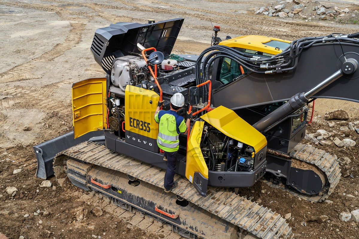 Volvo-graafmachines hebben een van de langste service-intervallen in de branche, waaronder motorolieverversingen om de 1000 uur en hydrauliekolieverversingen om de 3000 uur. Deze gesynchroniseerde intervallen, afgestemd op stappen van 1000 uur, vereenvoudigen het onderhoud en helpen de kosten te verlagen. De ECR355 is ontworpen om langer te blijven werken, met toonaangevende service-intervallen en vereenvoudigde onderhoudstoegang. De belangrijkste componenten zijn gegroepeerd voor gemakkelijke toegang, met vulopeningen op maaiveldhoogte en snelaftappunten om stilstand te minimaliseren.