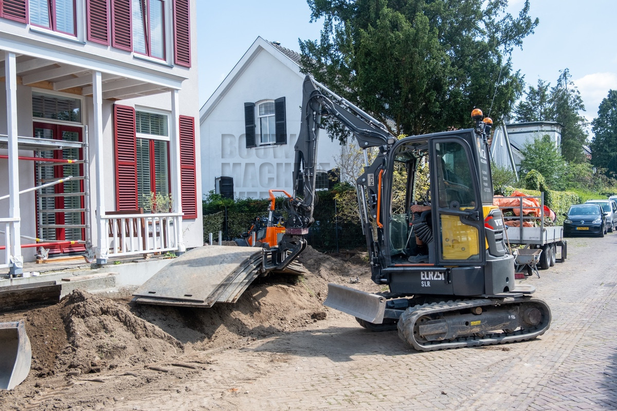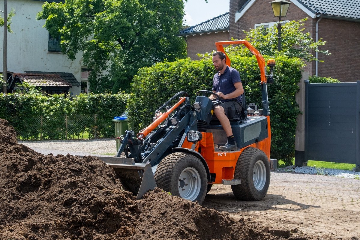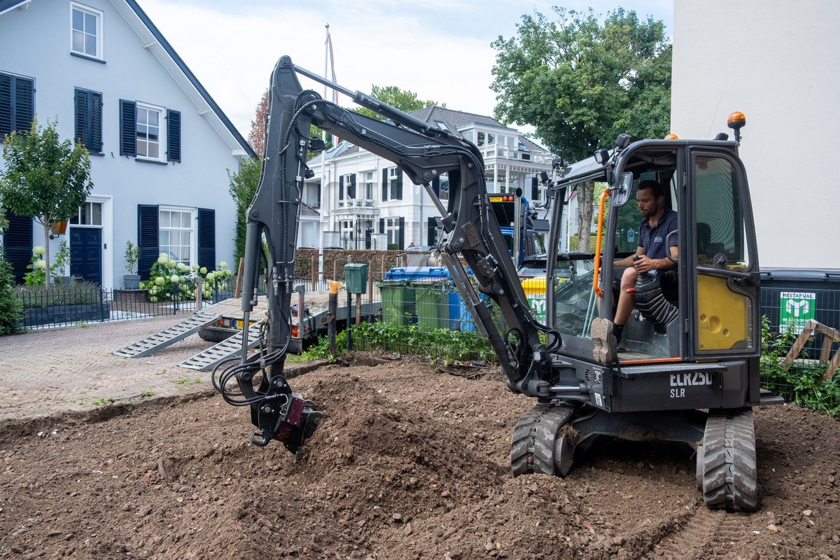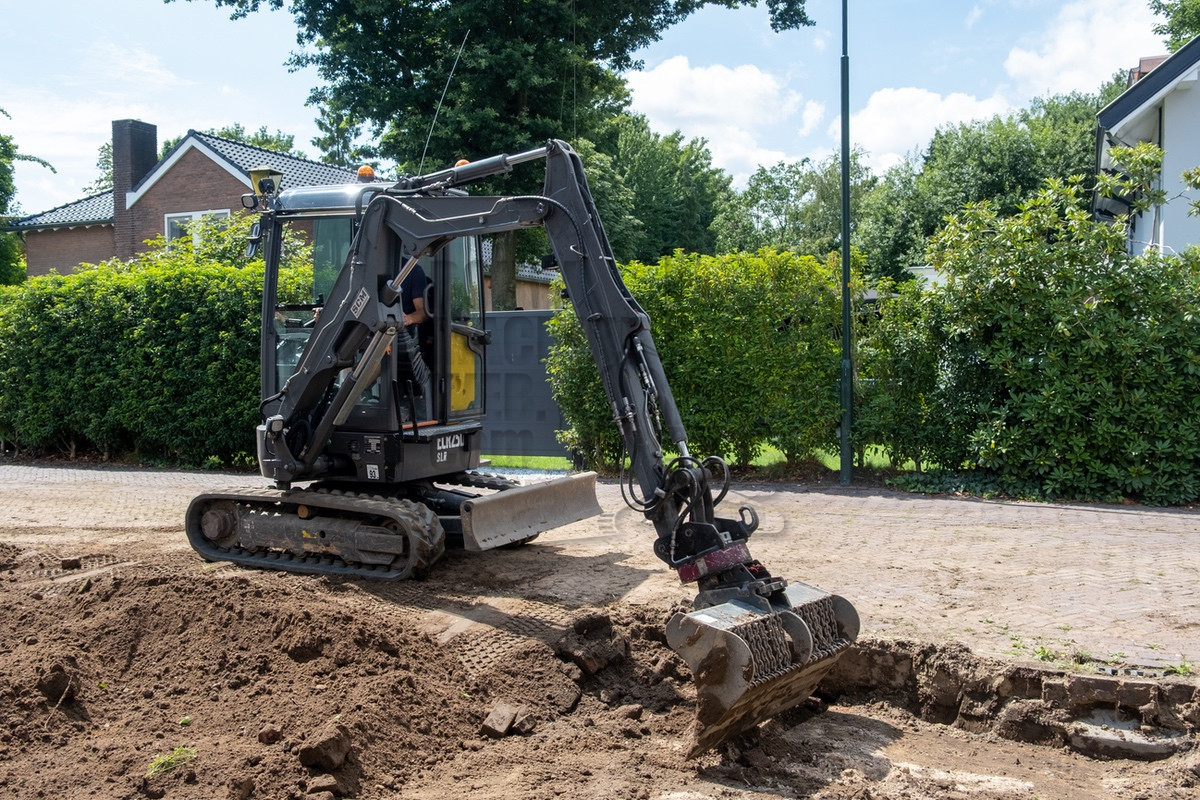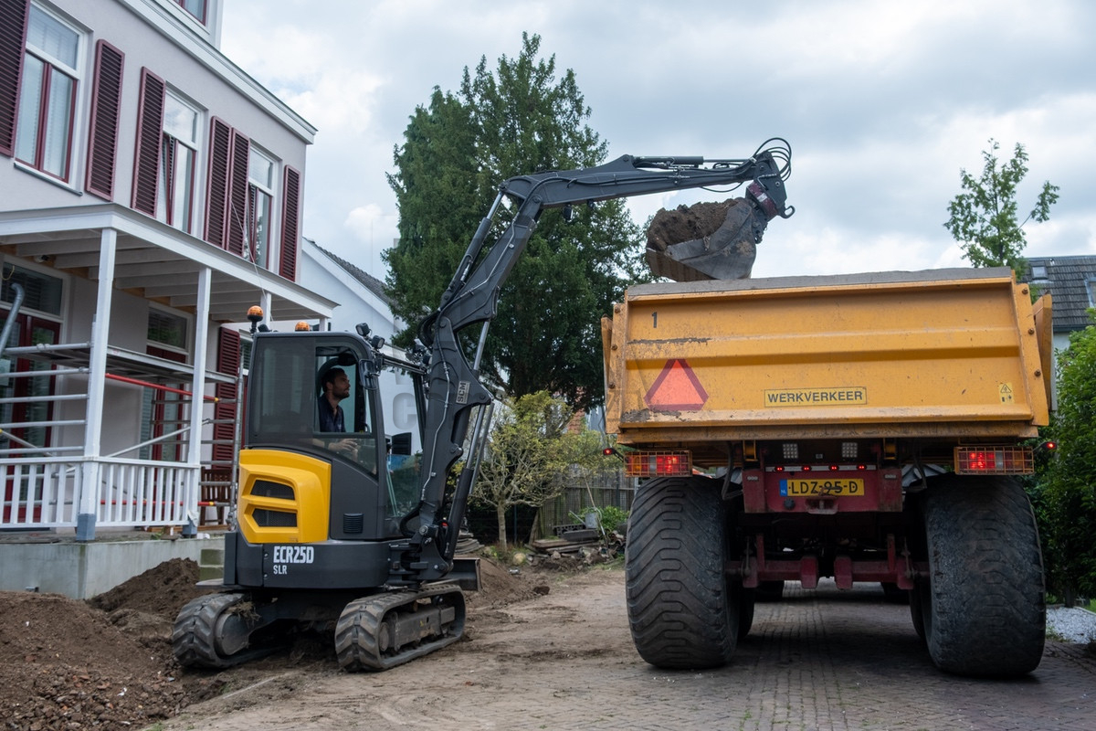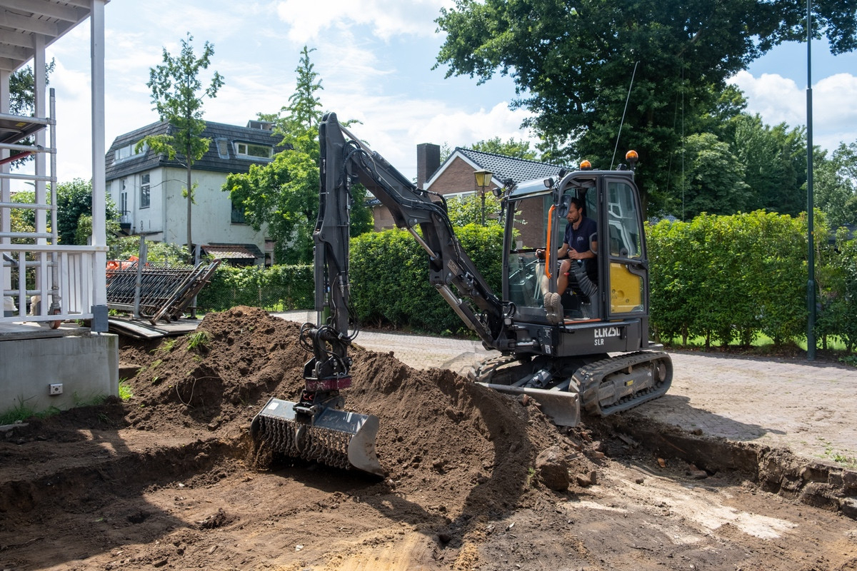 Tijdens ons bezoek was al snel duidelijk waarom Holleman de machine had laten aanpassen. De situatie was krap doordat de straat smal was en er voortdurend auto’s en fietsers voorbijkwamen. Op de locatie werd er een nieuwe inrit uitgegraven, waarbij de uitkomende grond aan de andere zijde op het perceel verwerkt moest worden. Hierbij kwamen de lange giek en de rotatiesnelwissel goed tot hun recht. Ook beschikt Holleman over een kettingbak, hierdoor bleef de leemhoudende grond niet in de bak plakken.