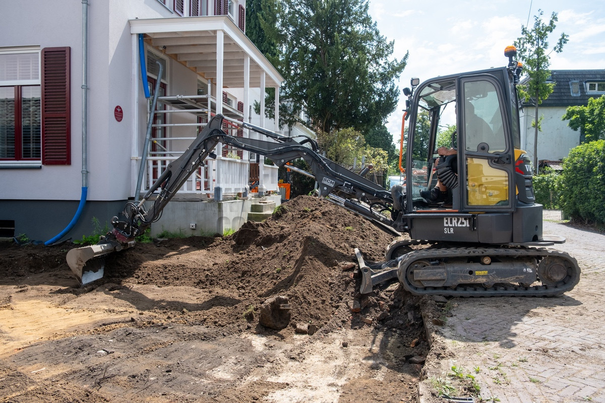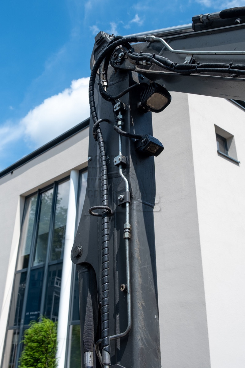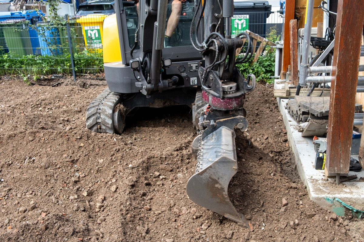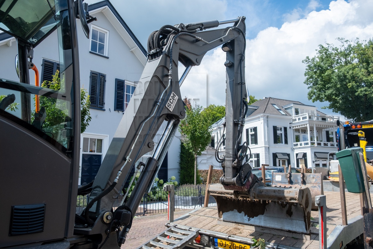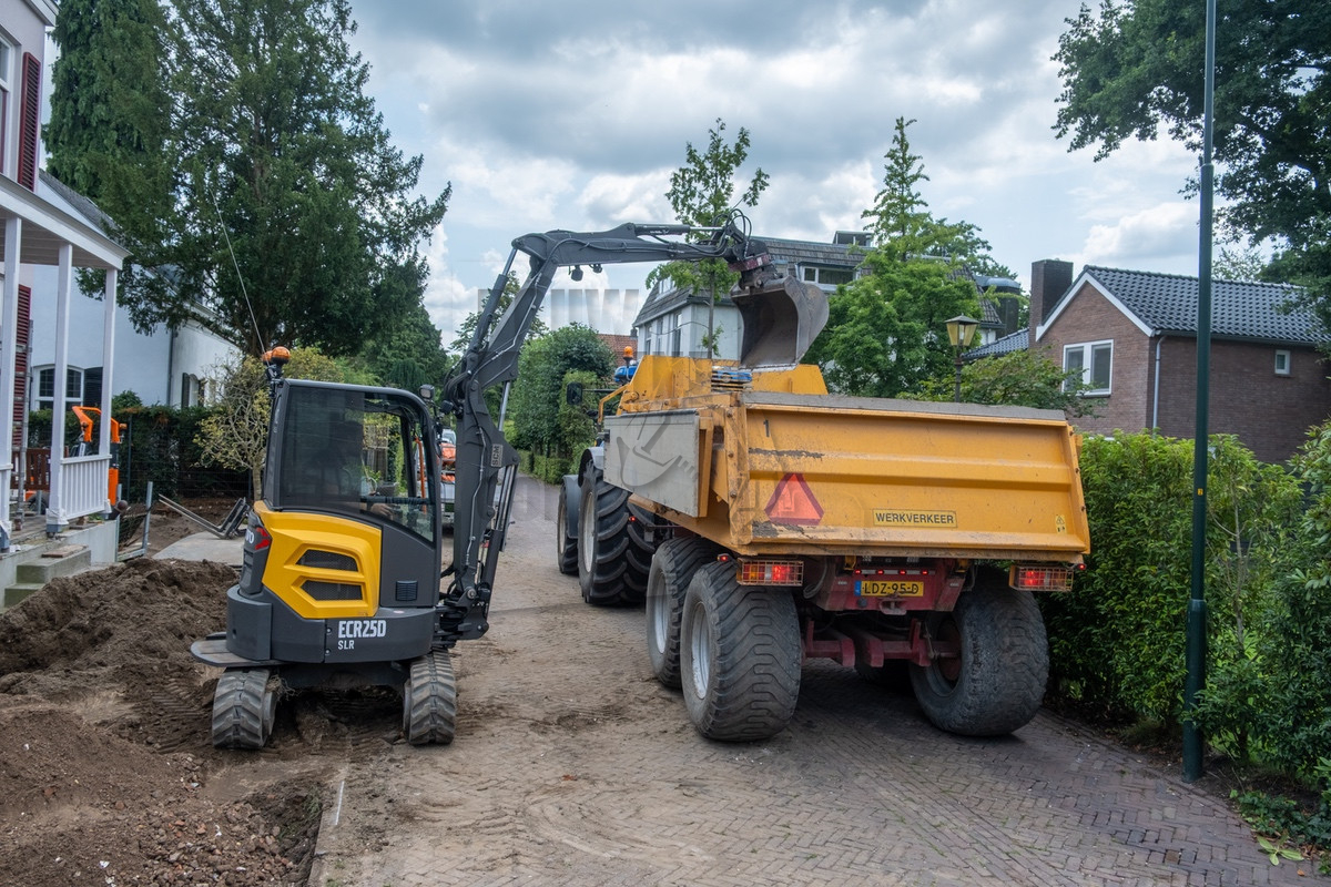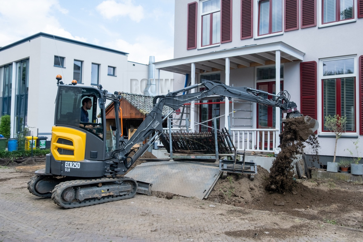 Tijdens ons bezoek was al snel duidelijk waarom Holleman de machine had laten aanpassen. De situatie was krap doordat de straat smal was en er voortdurend auto’s en fietsers voorbijkwamen. Op de locatie werd er een nieuwe inrit uitgegraven, waarbij de uitkomende grond aan de andere zijde op het perceel verwerkt moest worden. Hierbij kwamen de lange giek en de rotatiesnelwissel goed tot hun recht. Ook beschikt Holleman over een kettingbak, hierdoor bleef de leemhoudende grond niet in de bak plakken.