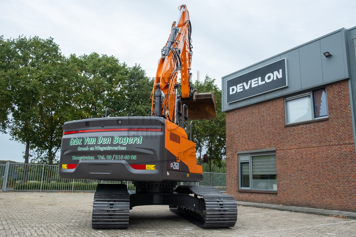 Gebr. Van den Bogerd wordt geleid door de drie broers Gert, Jan en Jef die het bedrijf in 2005 opgericht hebben. Met een team van circa 25 personeelsleden realiseren ze wegen-, riolering-, grond- en funderingswerken. De nieuwe DX260LC-9 is een toevoeging aan de reeds zeven bestaande Doosan/Develon machines. Tevens is het de zwaarste machine, ideaal voor het plaatsen van zware putten in het rioleringswerk.