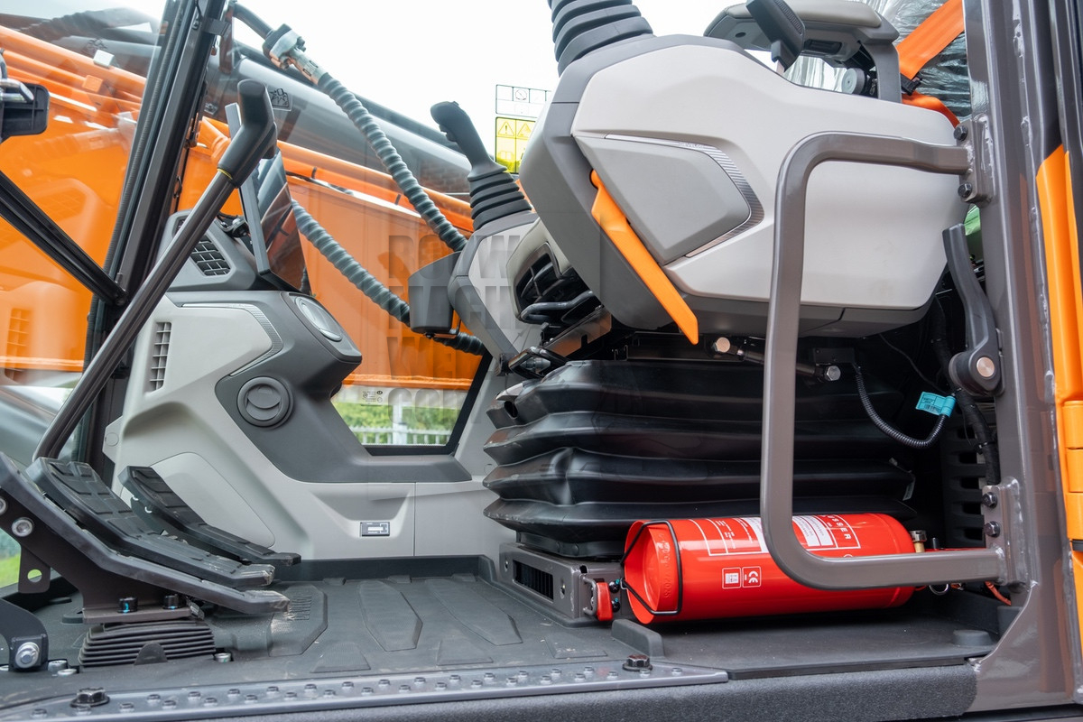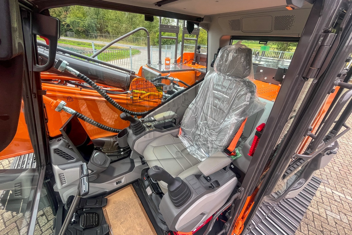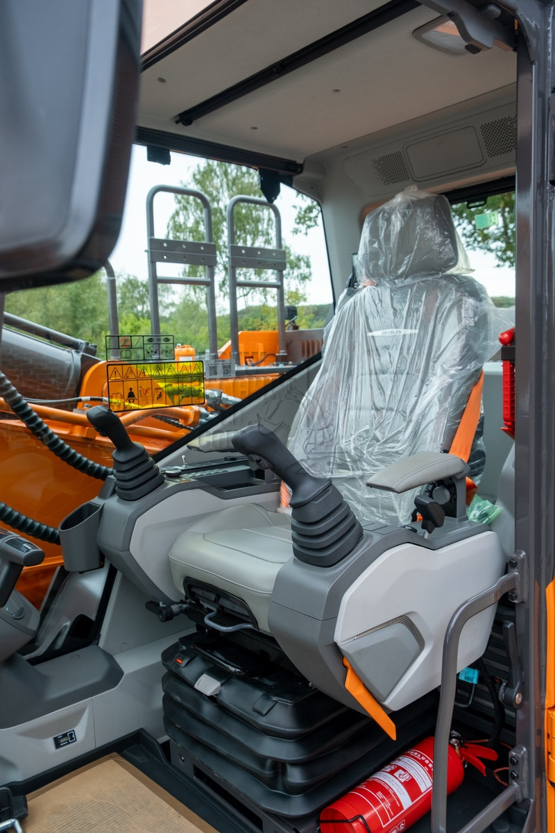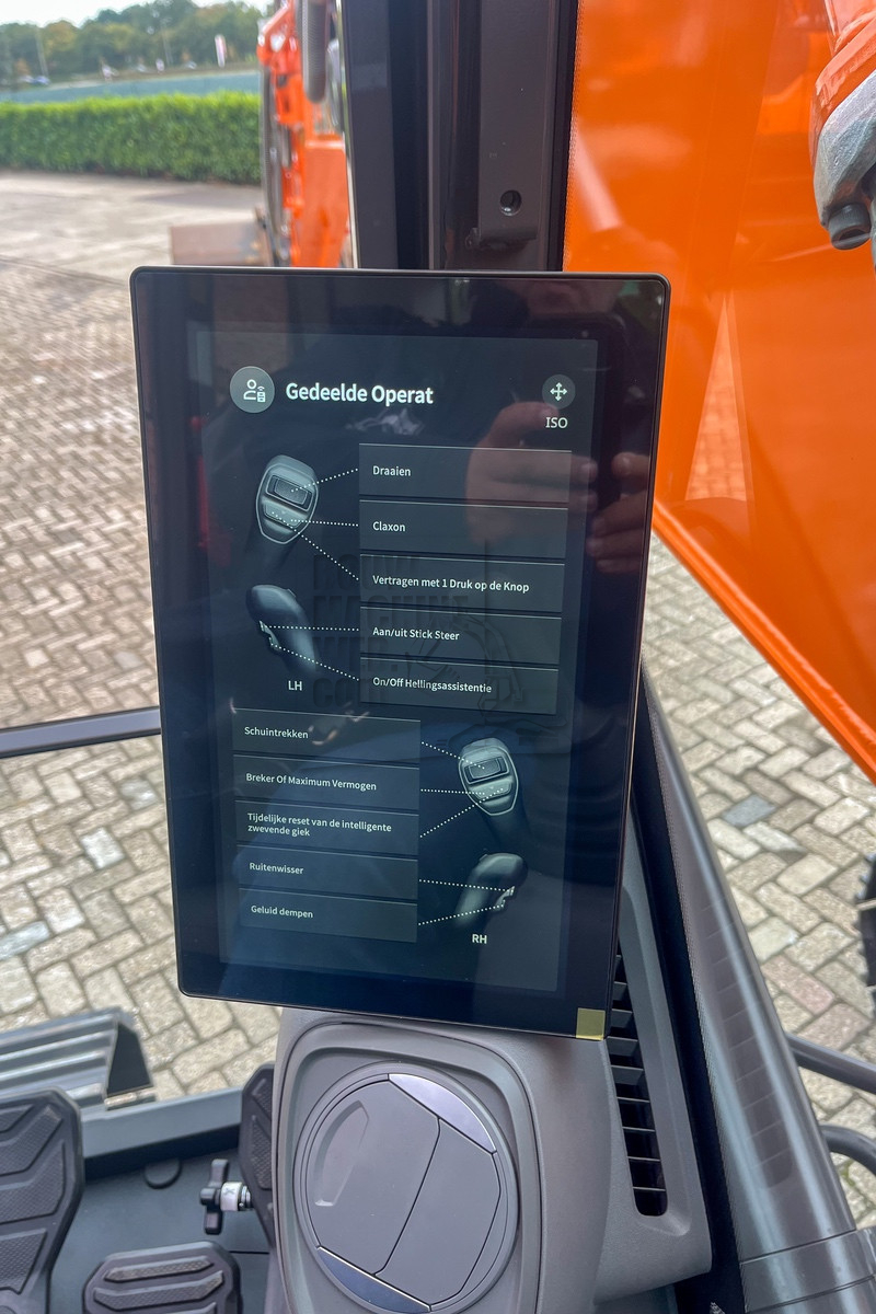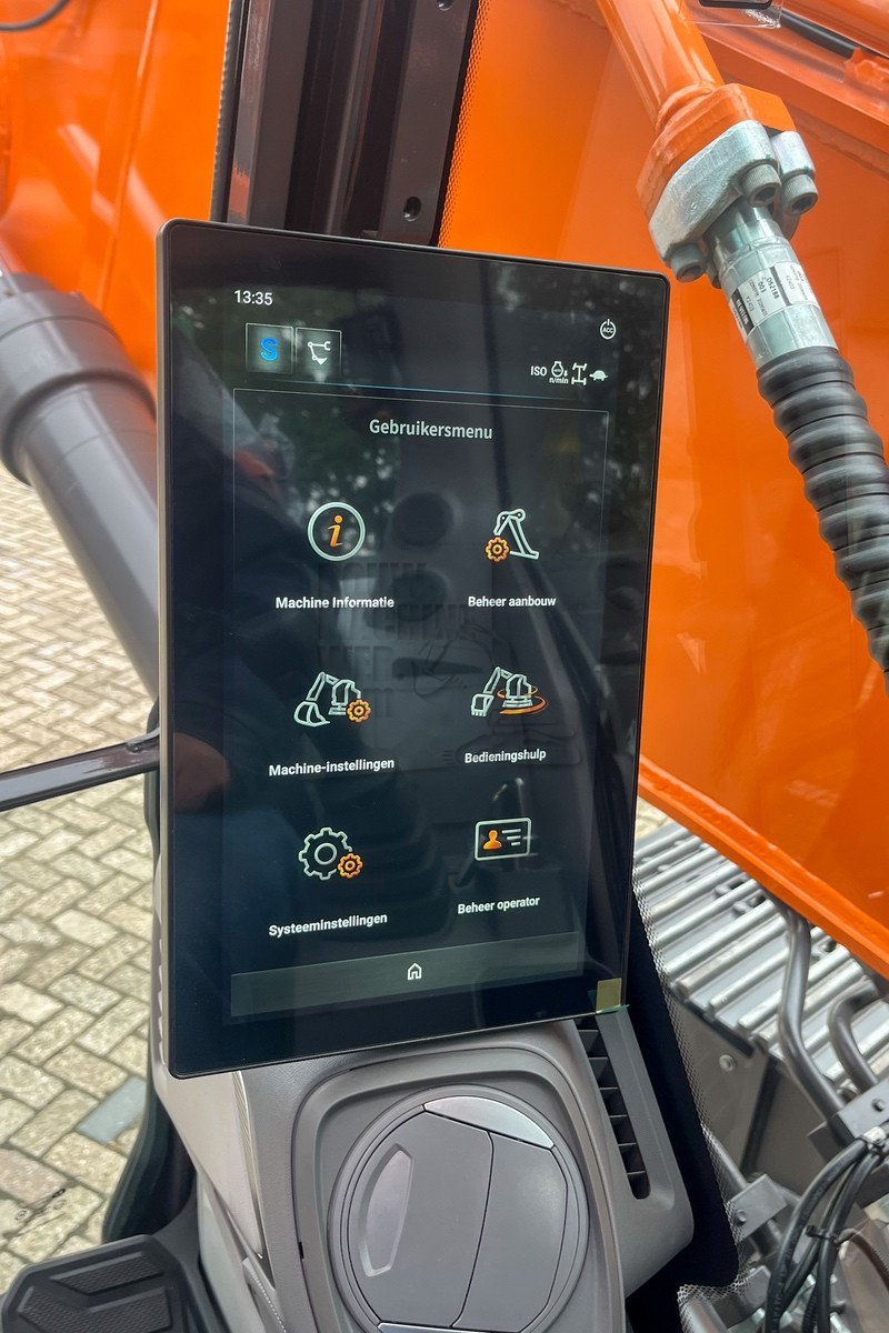 Opvallend aan de nieuwe cabine is de ruime instap, door het ontbreken van de hydraulische servo slangen is er rondom de stoel ook veel meer plaats. Omdat de servo nu elektronisch is, is er ook minder warmte en geluidsontwikkeling in de cabine. De ruitenwissermotor heeft nu een plek onder de cabine gekregen, waardoor de grote wisser het zichtveld voor de machinist ruim vrijhoudt. Zoals gezegd, via het touchscreen kan de machinist veel instellen. Optioneel kan hij hier ook de 2D-graafondersteuning, weegsysteem en geofencing instellen. Verder is er optioneel nog een tweede 12 inch display leverbaar waar bijvoorbeeld het optionele 360 graden camerasysteem op getoond wordt.