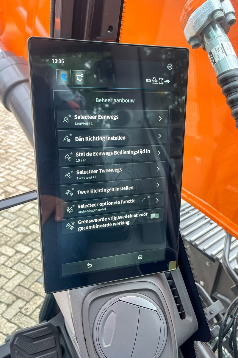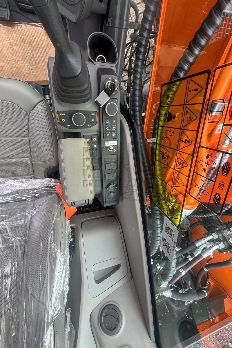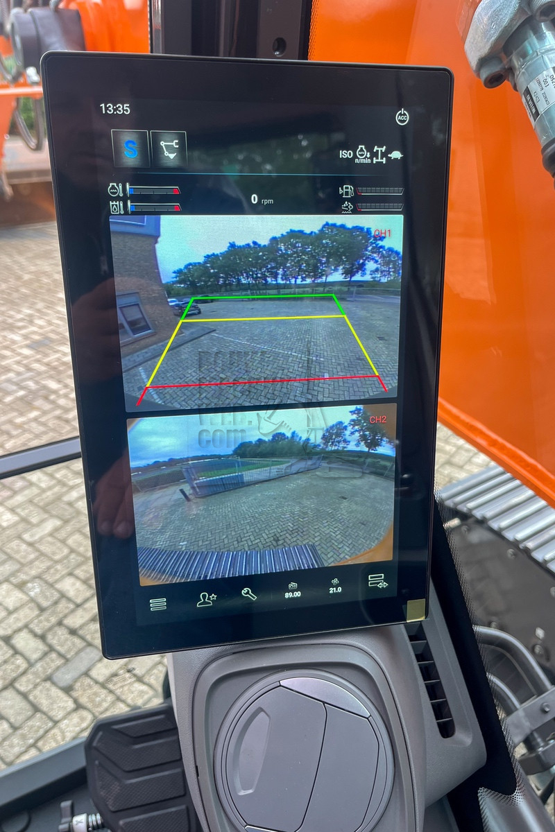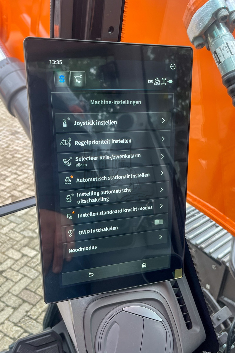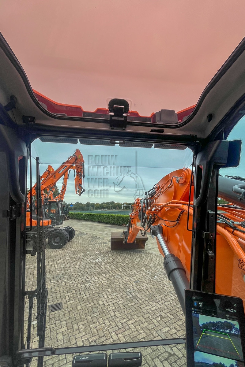 Opvallend aan de nieuwe cabine is de ruime instap, door het ontbreken van de hydraulische servo slangen is er rondom de stoel ook veel meer plaats. Omdat de servo nu elektronisch is, is er ook minder warmte en geluidsontwikkeling in de cabine. De ruitenwissermotor heeft nu een plek onder de cabine gekregen, waardoor de grote wisser het zichtveld voor de machinist ruim vrijhoudt. Zoals gezegd, via het touchscreen kan de machinist veel instellen. Optioneel kan hij hier ook de 2D-graafondersteuning, weegsysteem en geofencing instellen. Verder is er optioneel nog een tweede 12 inch display leverbaar waar bijvoorbeeld het optionele 360 graden camerasysteem op getoond wordt.