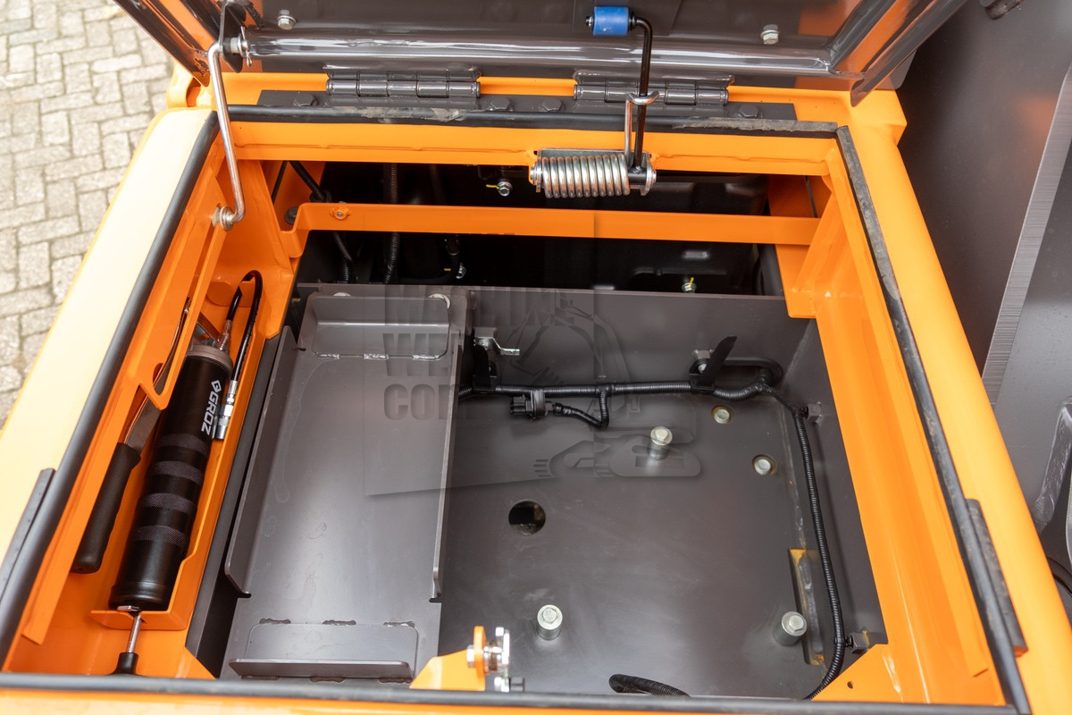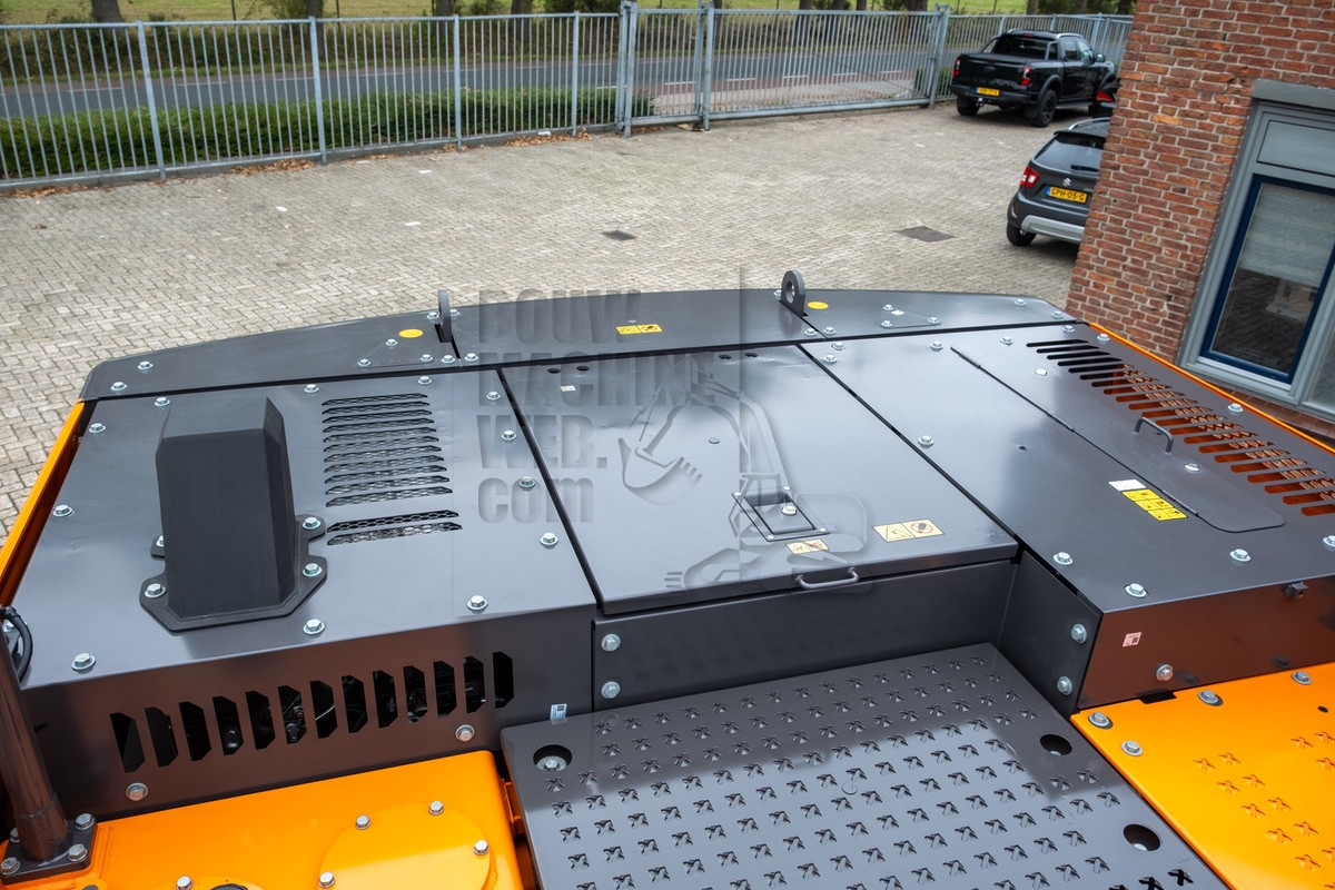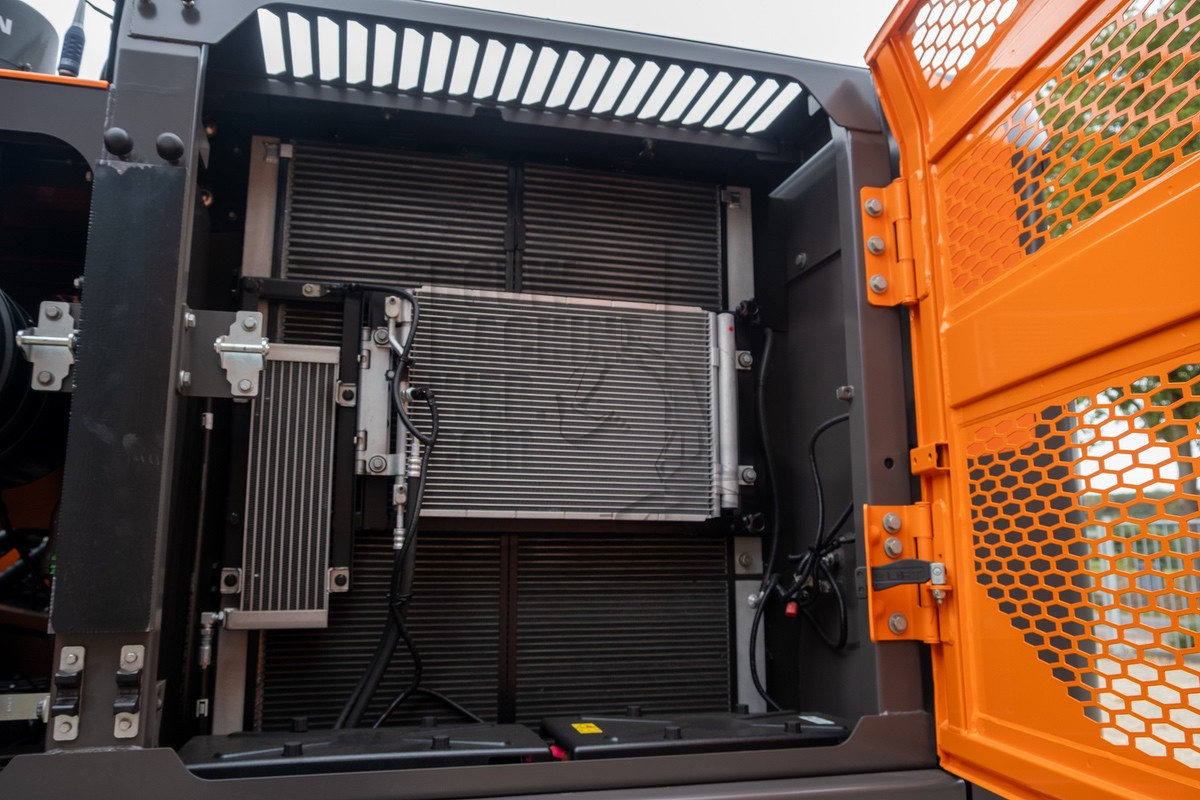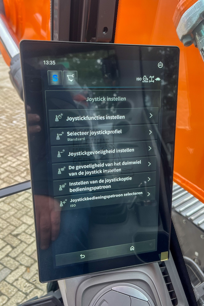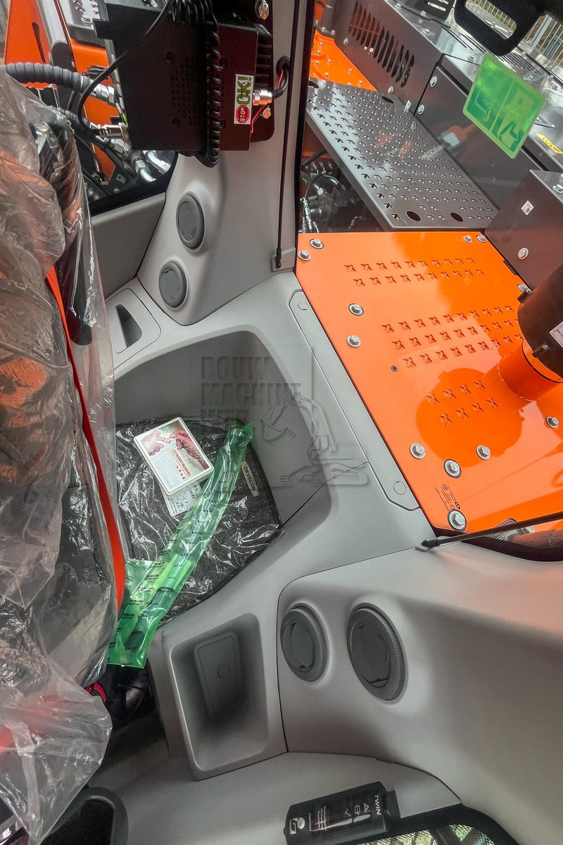 Opvallend aan de nieuwe cabine is de ruime instap, door het ontbreken van de hydraulische servo slangen is er rondom de stoel ook veel meer plaats. Omdat de servo nu elektronisch is, is er ook minder warmte en geluidsontwikkeling in de cabine. De ruitenwissermotor heeft nu een plek onder de cabine gekregen, waardoor de grote wisser het zichtveld voor de machinist ruim vrijhoudt. Zoals gezegd, via het touchscreen kan de machinist veel instellen. Optioneel kan hij hier ook de 2D-graafondersteuning, weegsysteem en geofencing instellen. Verder is er optioneel nog een tweede 12 inch display leverbaar waar bijvoorbeeld het optionele 360 graden camerasysteem op getoond wordt.