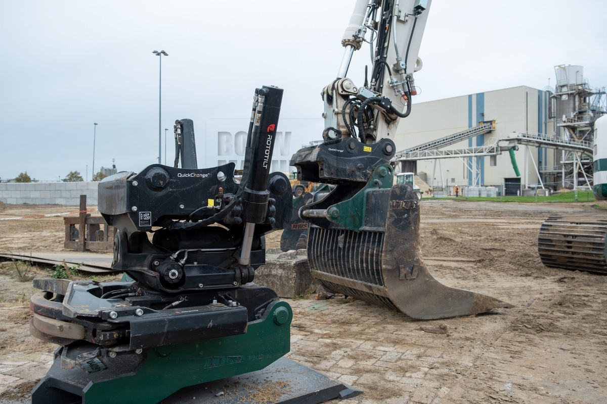 Om de machine nog flexibeler in te kunnen zetten, is deze ook uitgevoerd met een Rototilt RC6 draaikantelstuk geschikt voor machines van 15-24 ton gewicht, met natuurlijk een QC70-55 ophanging aan de bovenzijde zodat er snel en eenvoudig gewisseld kan worden. De RC serie is de allernieuwste generatie draaikantelstukken van de leverancier uit het Noord Zweedse Vindeln. Het concept van de draaikantelstukken van Rototilt wijkt af van de andere merken op de markt, Rototilt werkt niet met vet, maar heeft een oliegevuld rotorhuis. Jason Sanders van Rototilt licht toe: “Olie heeft bijzondere eigenschappen die gunstig zijn voor een draaikantelstuk; het wormwiel in een draaikantelstuk heeft een grote interne wrijving die warmte creëert. Die wrijvingswarmte wordt met behulp van de olie afgevoerd en verdeeld over het gehele rotorhuis. Dit zorgt voor een groot koeloppervlak, iets dat bij traditionele vetvulling niet mogelijk is. De optimale smering door olie zorgt ook voor een langere levensduur. Met olie bereik je alle kritieke punten in het systeem, wat zorgt voor optimale smering en minder slijtage. Na de eerste 500 draaiuren dient men de olie te verversen en vervolgens slechts eenmaal per jaar bij het reguliere onderhoud. Met het aflaten van de olie worden alle vuil en partikels snel en eenvoudig uit de Rototilt verwijderd”.