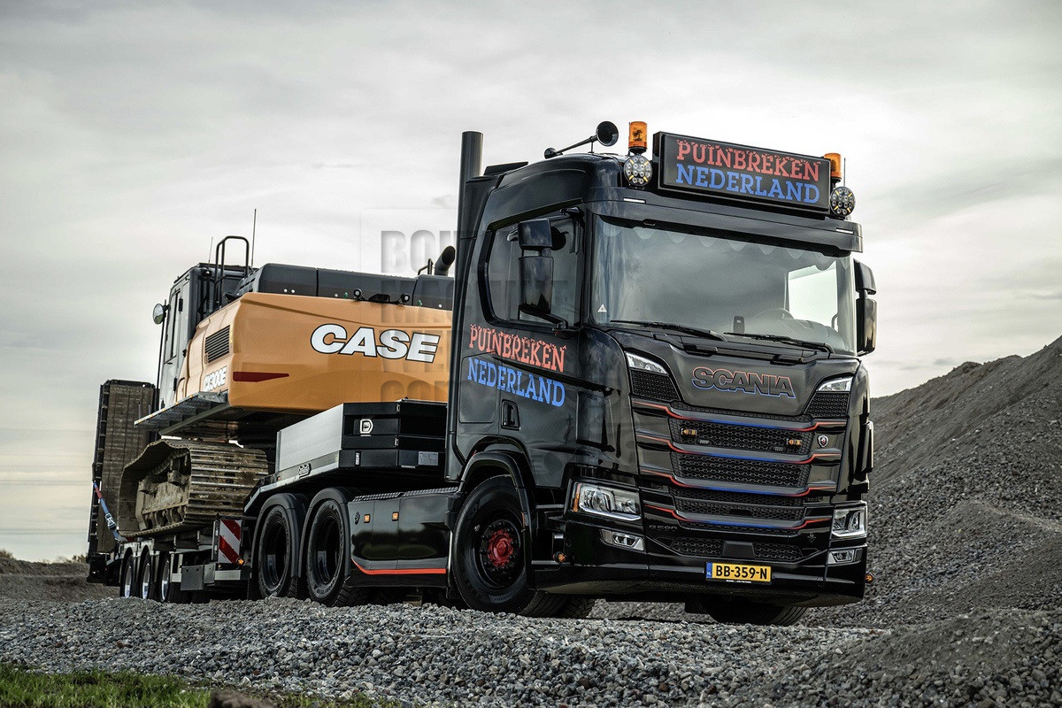 Puinbreken Nederland heeft onlangs een nieuwe Scania zwaartransporttrekker in gebruik genomen. Het gaat om een drieassige 6x4 trekker met 590 pk V8 motor, speciaal uitgerust voor transporten tot 90 ton. Met de komst van dit voertuig haalt het bedrijf het transport van eigen breker, rupsgraafmachine en wiellader voortaan grotendeels in eigen beheer.