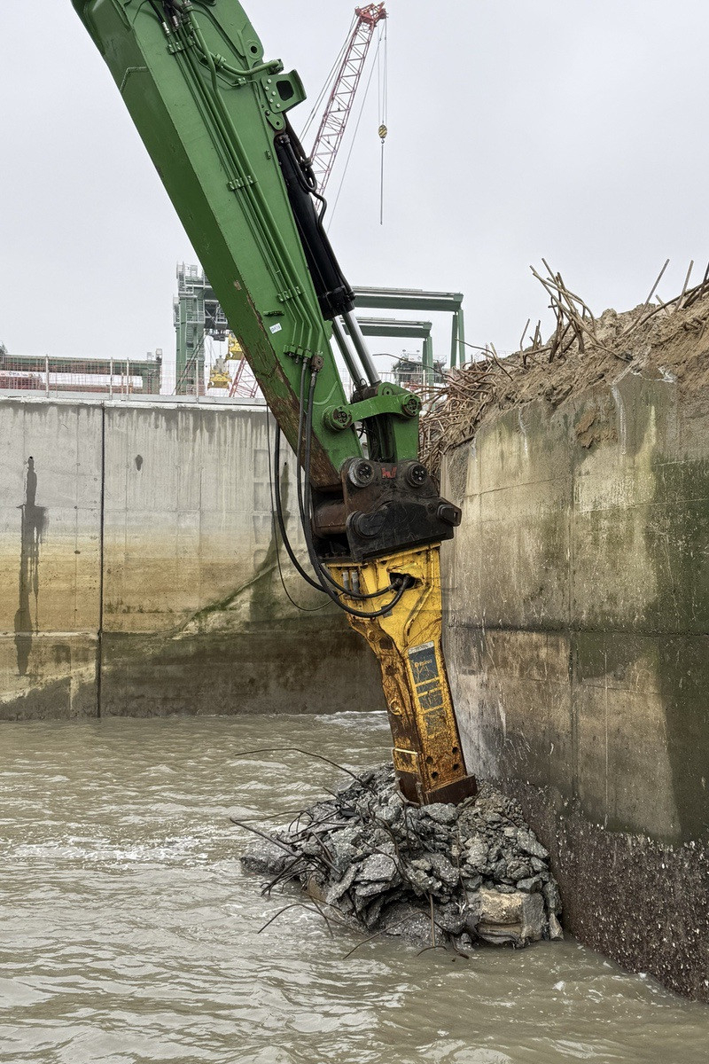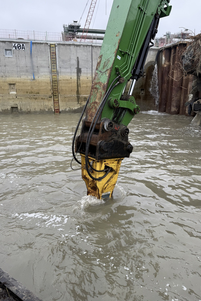 Het middelpunt van het demontageproces is de Epiroc HB 7000 hydraulische hamer, geleverd door Saes International B.V., Epiroc's partner voor Nederland en België. De hamer is speciaal geconfigureerd voor onderwaterwerk en kan werken op diepten tot 24 meter – een zeldzame mogelijkheid in de branche.
