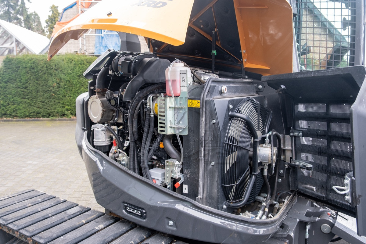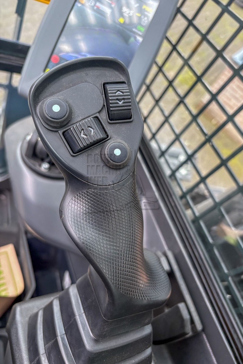 We kregen zelf de mogelijkheid om de machine te proberen. Wat opviel is dat de machine direct in de hand ligt. Door de loadsensing hydrauliek met flow sharing, wordt de olie gelijkmatig verdeelt, waardoor de machine zeer nauwkeurig zich laat bedienen. Het laten zakken van de giek is ‘geknepen’, waardoor deze niet ongecontroleerd naar beneden kan zakken. Twee krachtige hefcilinders en dito steelcilinders zorgen voor een krachtige giek. De bakcilinder is voorzien van een extra bescherming van de zuigerstang.