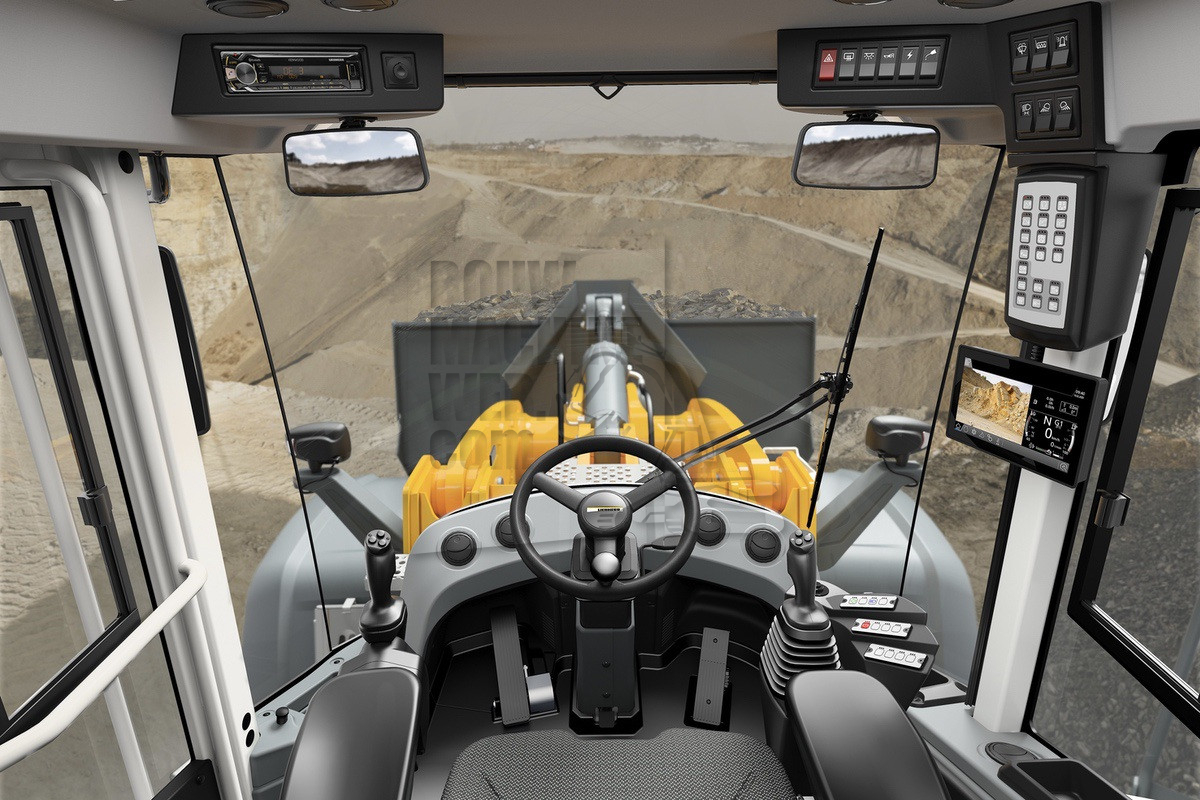 De ergonomisch ontworpen cabine met zijn grote, beglaasde oppervlak zorgt voor uitstekend zicht rondom en een hoog niveau van comfort voor de machinist. Talrijke uitrustingsopties maken het mogelijk de cabine naar individuele wensen te configureren – inclusief de stuurwielvrije ‘joystick only’-versie, die royale ruimte en verbeterd zicht op de hefarm en werkuitrusting biedt. Een reeks optionele assistentiesystemen verhoogt de veiligheid en efficiëntie verder. Alle systemen zijn ontwikkeld door Liebherr en zijn daarom volledig geïntegreerd in de besturingsarchitectuur van de machine.