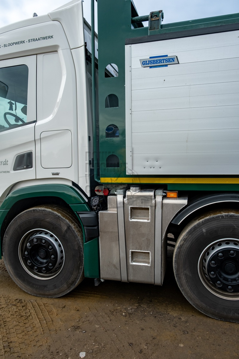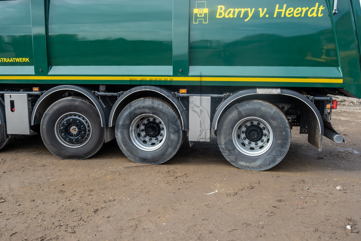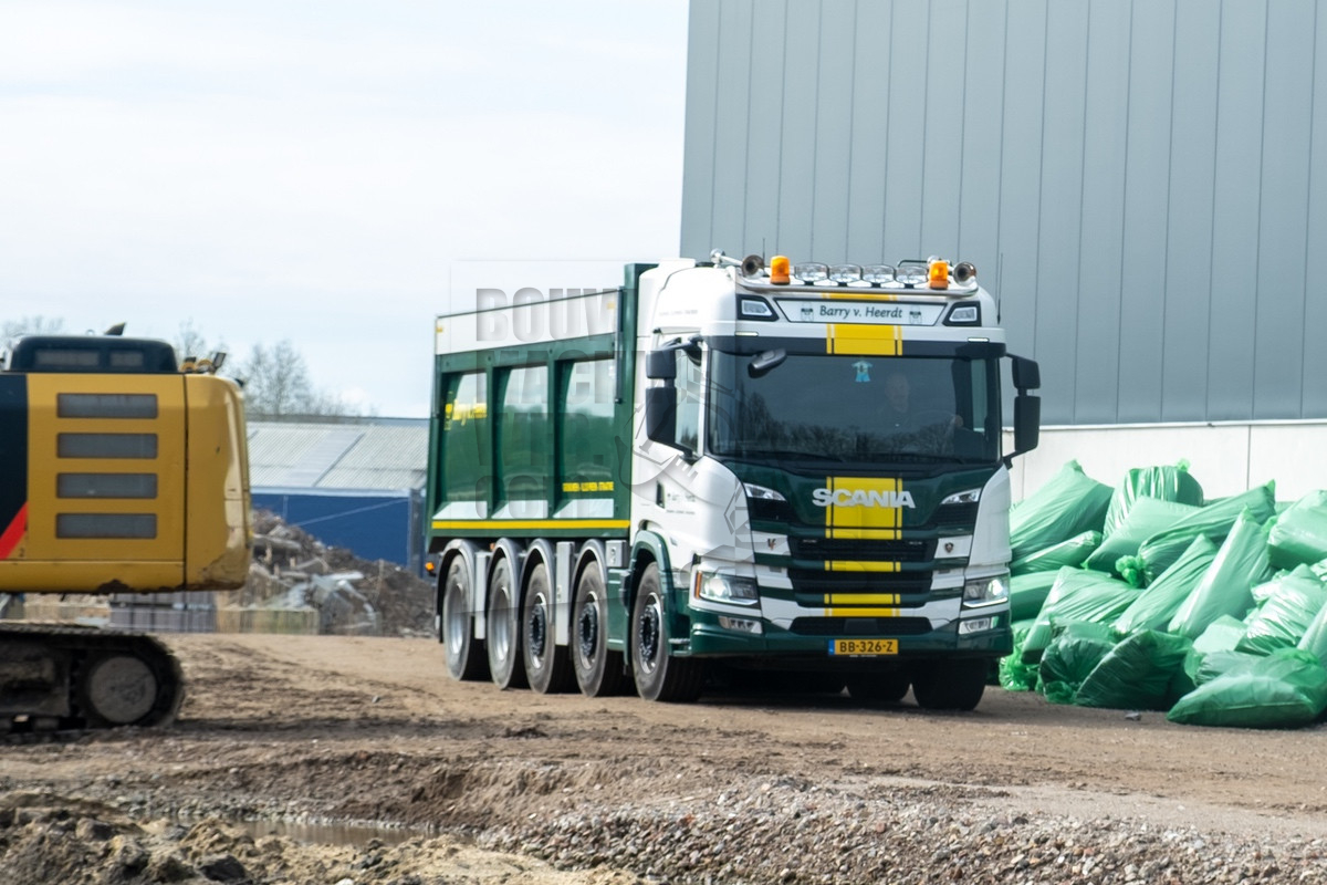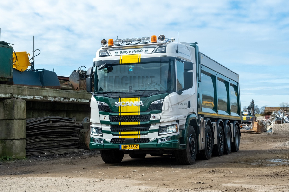De Scania 13 liter staat al bekend om zijn zuinig brandstofverbruik, maar in combinatie met enkele reductie achterassen wordt dit geoptimaliseerd. Barry van Heerdt koos voor deze combinatie omdat het kipperwerk steeds meer over langere afstand gebeurt en het terreinwerk steeds minder wordt door het toepassen van rijplaten. Voor meer tractie kan de derde as tot 30 km/u gelift worden en beschikt de Scania natuurlijk over dwars- en langssperren. Met de door Veldhuizen Trucks gebouwde 50 tons 10x4 ontstaat er een truck die geschikt is voor gemengd gebruik. Door de toepassing van luchtvering is er een laag chassis, waardoor de Gijsbertsen kipper laag opgebouwd kan worden en ontstaat er tevens een laag zwaartepunt. Compleet opgebouwd met kipper heeft de Scania een indrukwekkend laadvermogen van 31,5 ton.